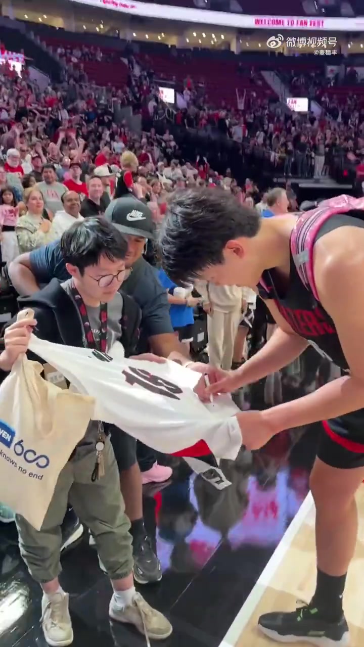 笑死!开拓者球迷日上,杨瀚森背着粉红色小书包给球迷签名!