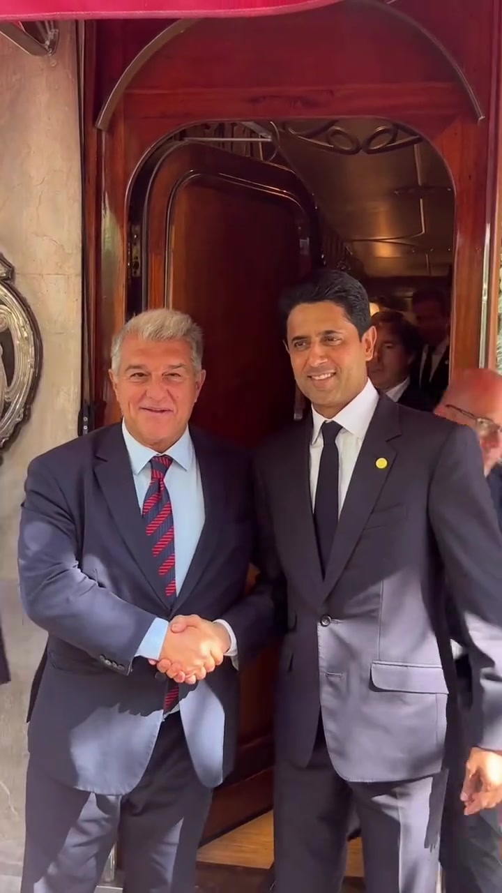 友好巴黎主席纳赛尔与巴萨主席拉波尔塔赛前聚餐