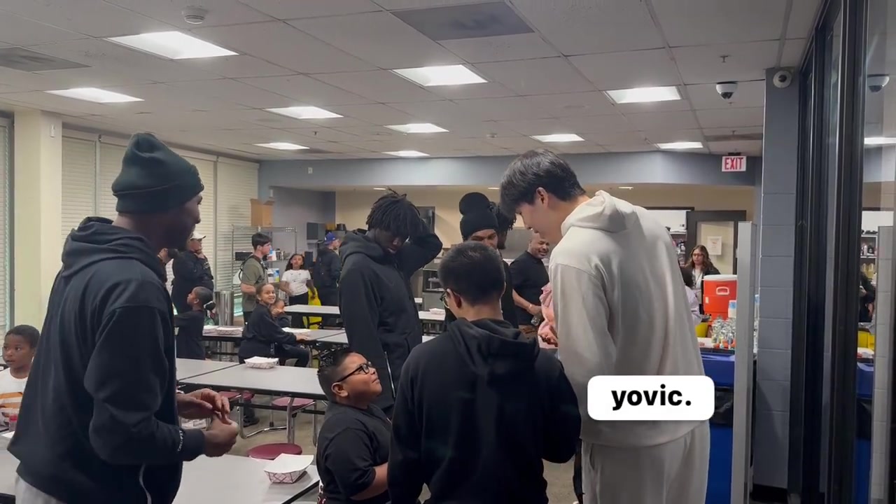 很腼腆呀!杨瀚森跟随老大哥利拉德一起参加社区活动