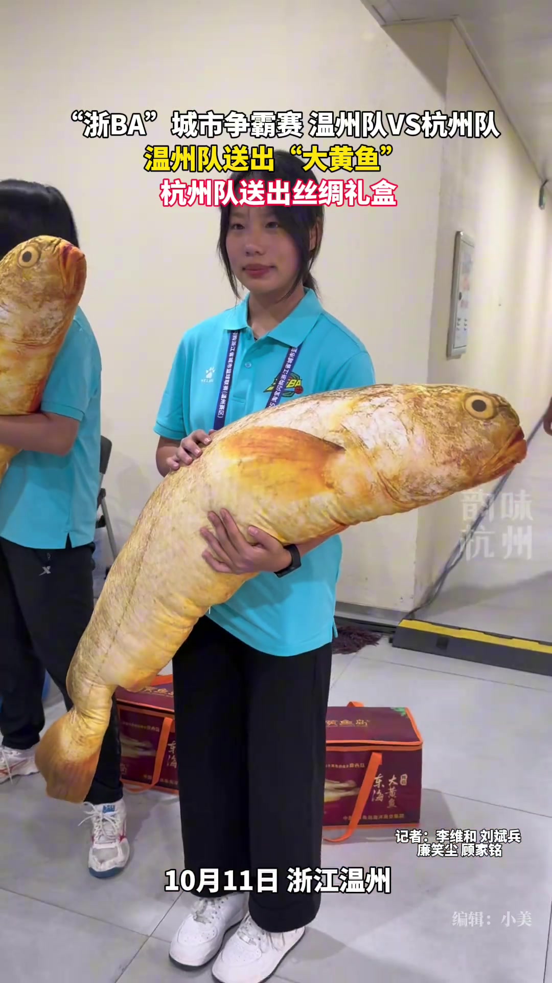 浙BA温州队VS杭州队,温州队送出特产大黄鱼,杭州队送出丝绸礼盒