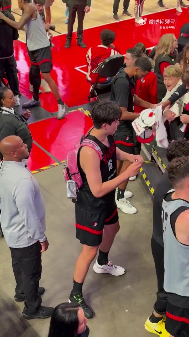 这一幕还挺可爱!杨瀚森背着仙女书包把手里礼物给了两位小朋友