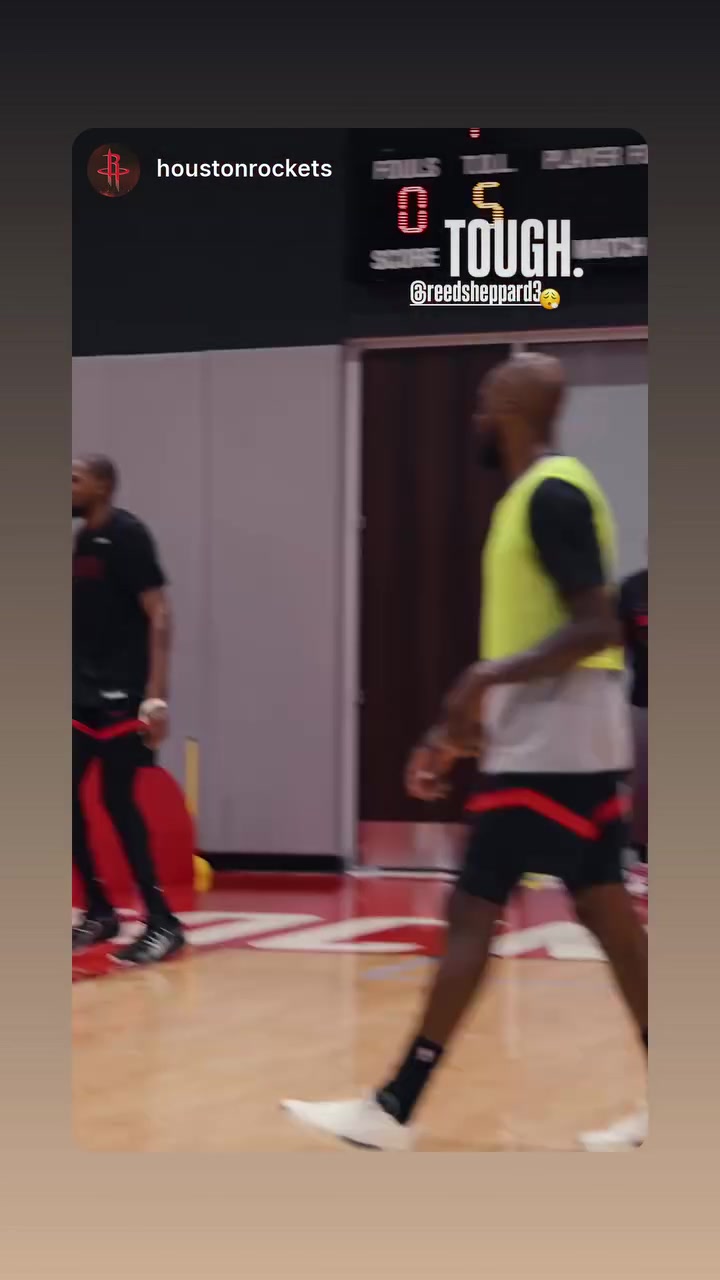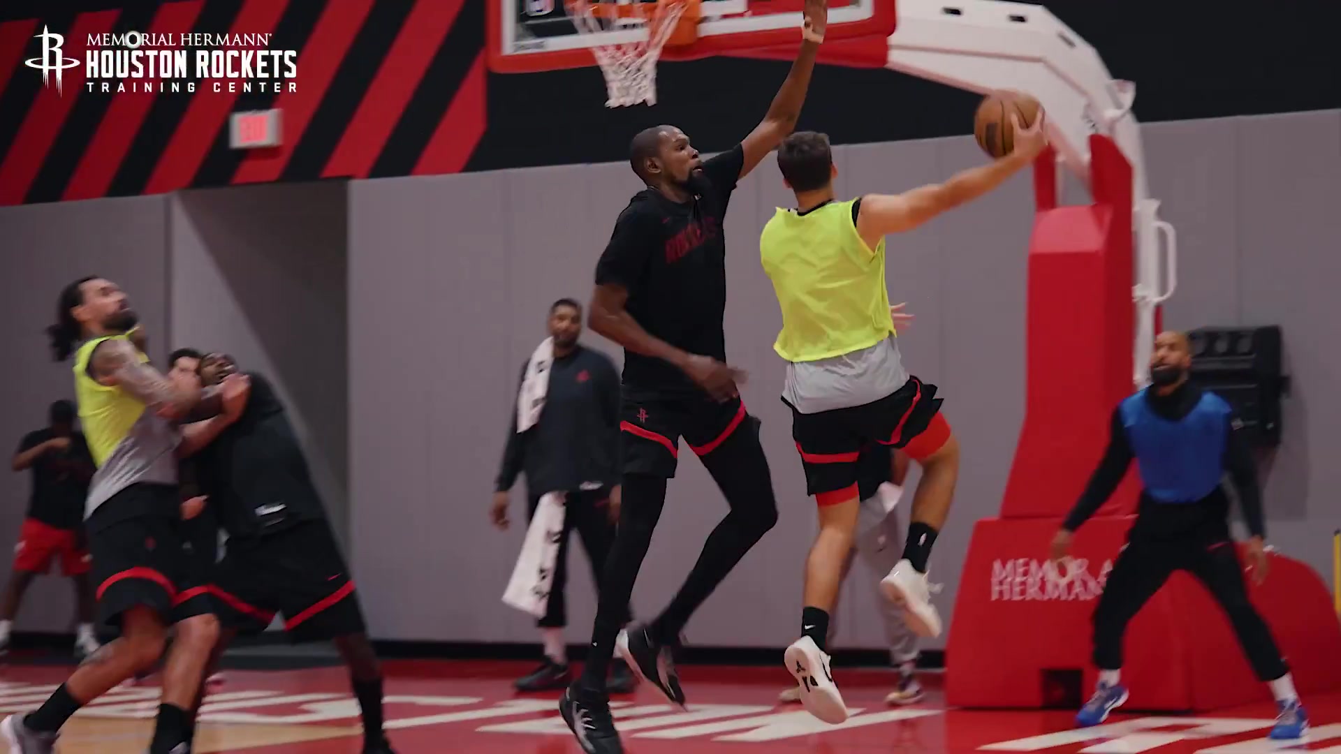 谢泼德在训练中迎着KD长臂勾手打进,这球应该看不到框了吧