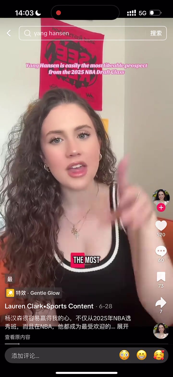 TikTok女主播变杨瀚森迷妹:杨瀚森是NBA最可爱球员