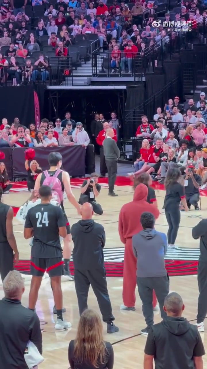 开拓者球迷日,杨瀚森和助教沟通,随后兴奋地开始热身